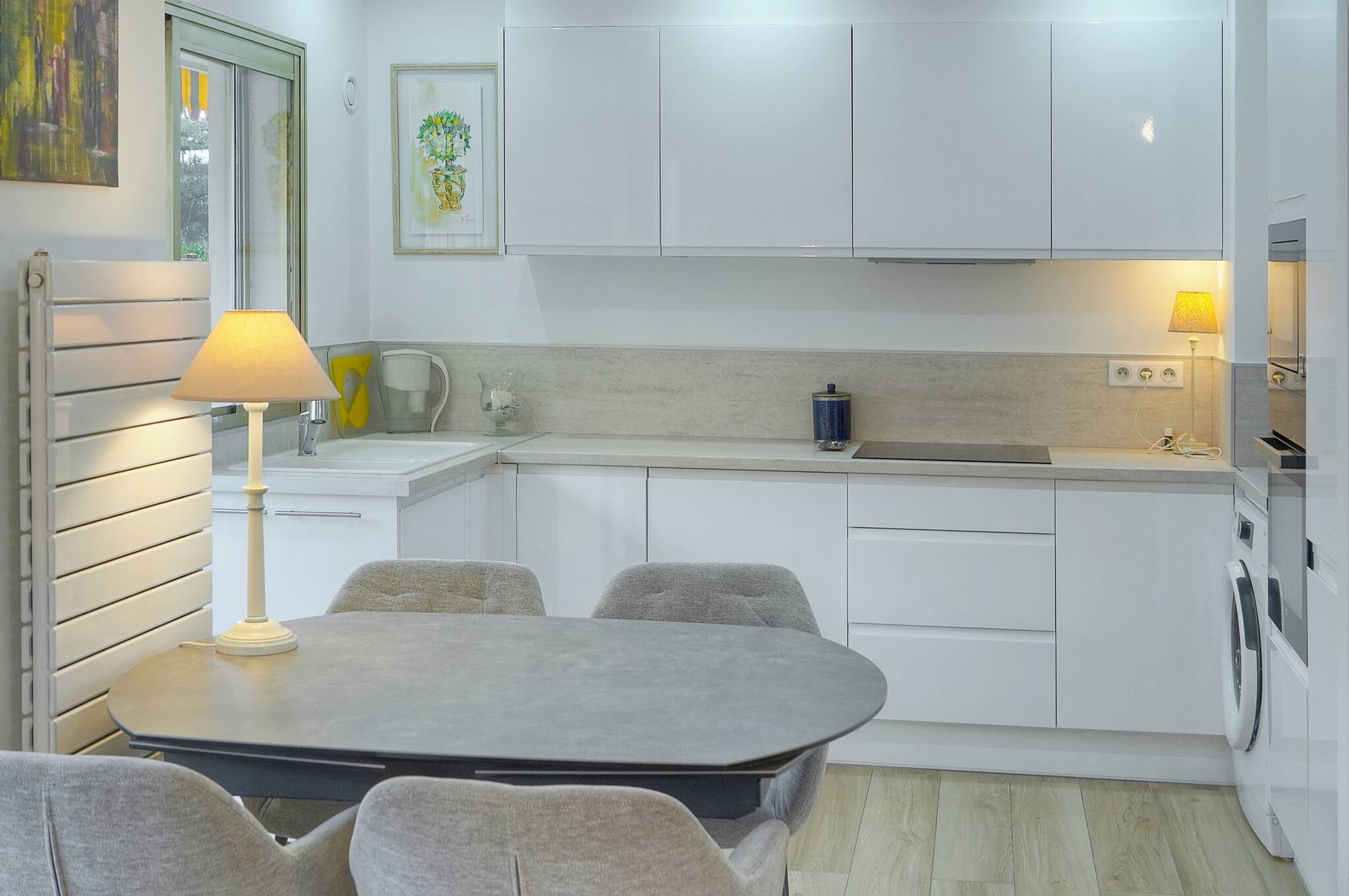 L'appartement dispose d'une chambre avec un lit double et un canapé-lit, permettant d'accueillir confortablement jusqu'à 4 personnes. La cuisine américaine entièrement équipée ravira les amateurs de cuisine : plaque à induction, réfrigérateur, congélateur, four, micro-ondes, machine à café, bouilloire, grille-pain, et une collection complète de vaisselle et ustensiles de cuisine.
